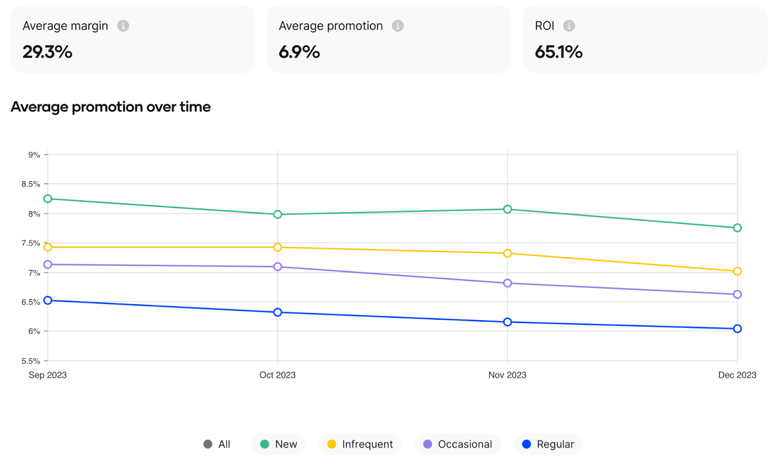 Our promotion generation tool is constantly working to generate the most efficient promotion to bring each customer into your store. On this page, you can explore the average promotion accepted by each customer type and how those promotions are trending over time. These metrics provide additional insights into your customer behavior, specifically on what incentivizes them to transact with your business. Additionally showcasing the value of personalized promotions and that you can earn more profit by not having to give the same promotion to every customer type.