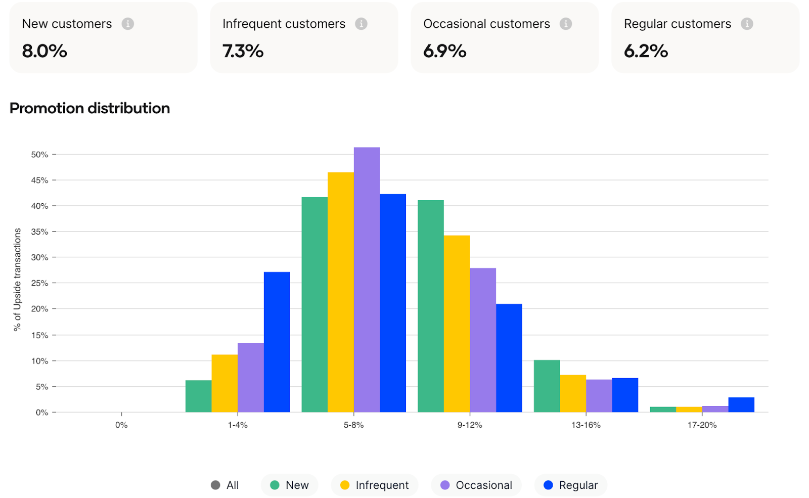 The next chart allows you to see the distribution of promotions, and how Upside optimizes to find the perfect promotion amount for every customer. Most promotions fall in the middle range, but occasionally, larger promotions may be required – particularly for new customers. Notice how the algorithm adjusts to give away smaller promotion amounts to more loyal customers. This adaptive approach ensures that your promotions are always finely tuned to the unique needs of each customer segment.
