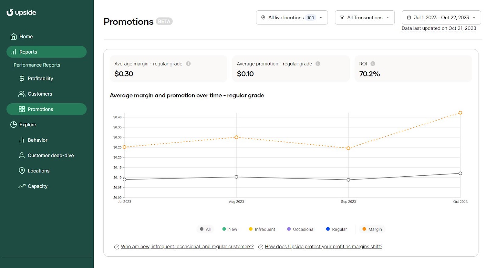 At the top of the page, you'll find key metrics, including your average margin (which you provide to us, so make sure it's accurate), the average promotion amount, and Upside's ROI for your selected time period. The date ranges can be customized via the drop-down, giving you the flexibility to analyze different periods. Select the icon to learn more about the metric or customer segment.